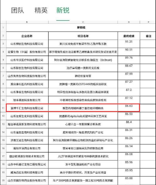 2017年4月末,为深入贯彻落实山东省委、省政府《关于深化科技体制改革加快创新发展的实施意见》,省科技厅会同省财政厅、山东银监局、省知识产权局共同组织实施“山东中小微企业创新竞技行动计划”(简称“行动计划”)。“行动计划”设企业组、团队组,其中企业组分新锐类企业、精英类企业两类。分电子信息、新材料、新能源及节能环保、生物医药、先进制造、互联网及移动互联网、现代农业、海洋科技8个技术领域。 淄博千汇生物科技有限公司携项目“新型药用辅料-磺丁基倍他环糊精钠”参与此次行动计划的竞技评选。省内各市生物医药领域新锐组参赛企业共计104家,通过为期2个多月的网上初选,千汇作为本领域前50名参加现场晋级赛。 8月3日,山东省中小微企业创新竞技行动计划生物医药领域现场晋级启动仪式在烟台高新区举行。山东信息通信技术研究院管理中心副主任王文、烟台市科技局副局长毕秋军、烟台高新区管委副主任孙恒基出席活动。